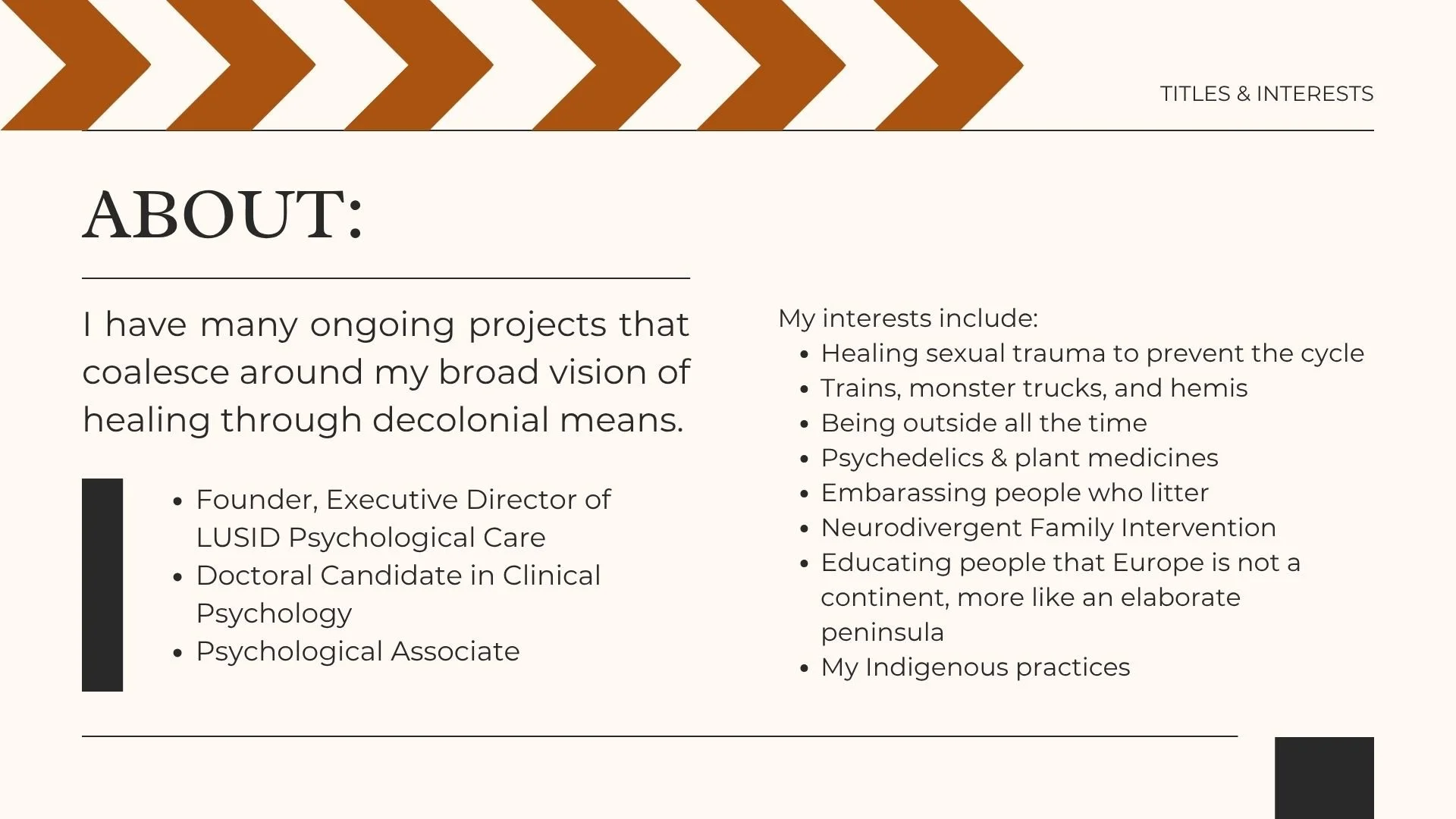 I have worked in psychedelic research, writing the protocol and proposal for an MDMA and Shame clinical trial. I have worked in personal care for disabled people with hard problems to work through. I have worked for the State government training supervisors and experts on neurodivergence and EDAI in the workplace. I have been invited into Black spaces to teach about the connection between the body and spirit. I have succeeded in demanding that the curriculum be changed three times, once in high school, once in undergrad, and once in graduate school because it wasn't up to my standards